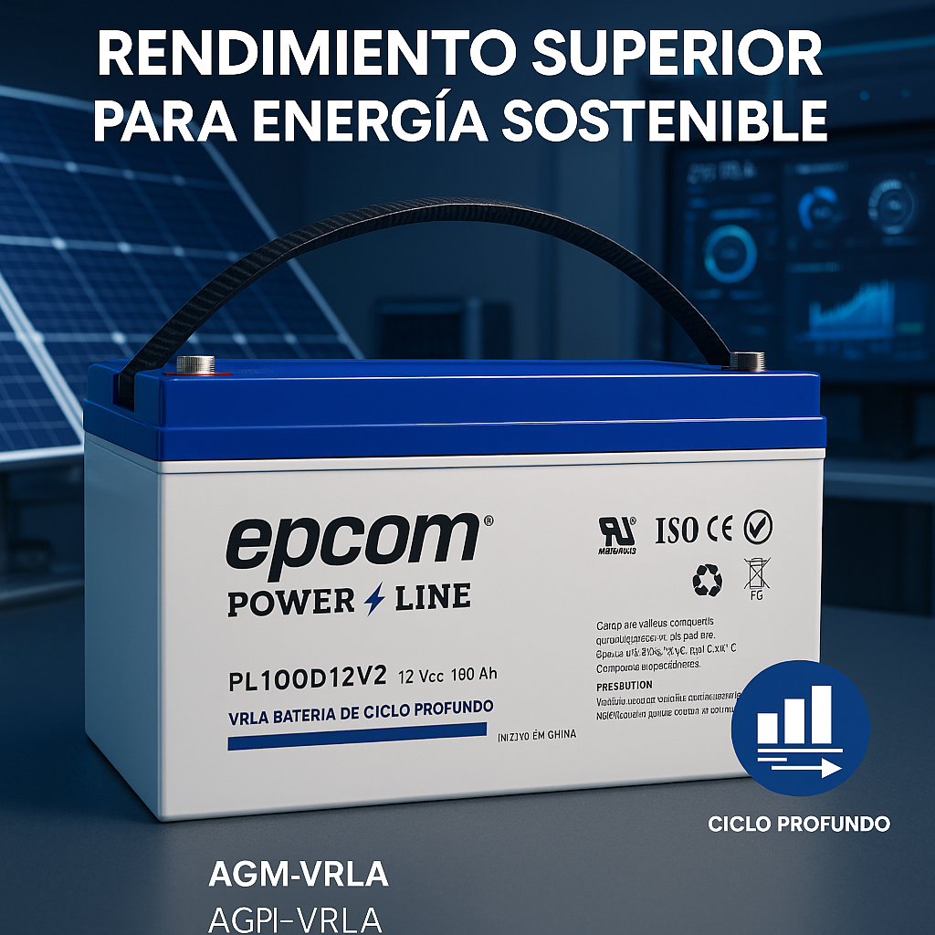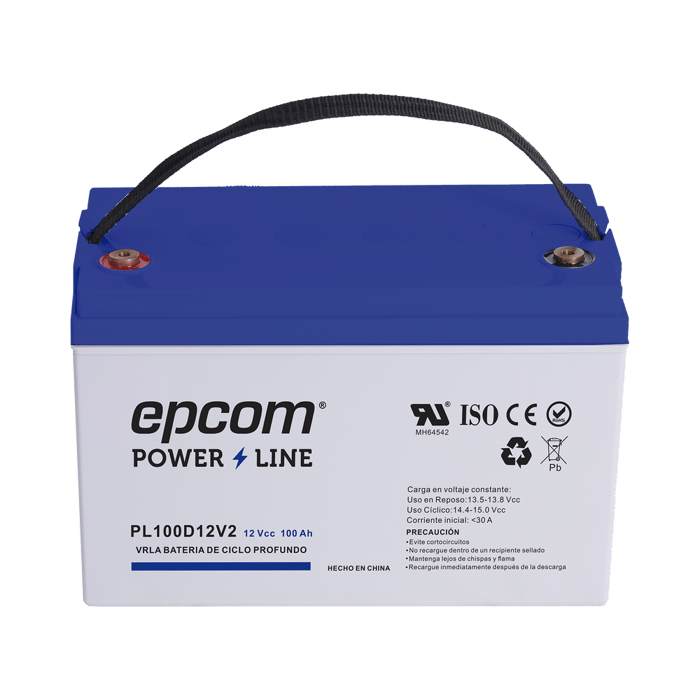 Batería sellada AGM-VRLA (Absorbent Glass Mat, válvula regulada) de 12 Vcc y 100 Ah, diseñada para respaldo de equipos electrónicos y sistemas de alimentación de emergencia. Emplea placas de alto rendimiento y electrólito de ácido sulfúrico absorbido en fibra de vidrio, lo que asegura baja autodescarga, alta confiabilidad y cero mantenimiento. Vida útil en flotación de 5 años a 25 °C. Certificada UL (MH62092) y UL94-HB en resistencia al fuego.